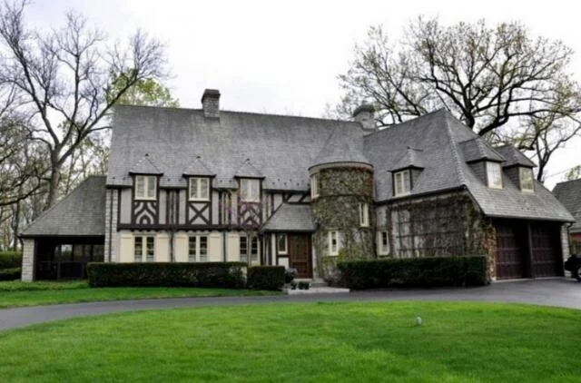 This stately Tudor Revival manor house was built in 1911 for Charles F. Paxton, who played polo at the Onwentsia Club from 1912-1914, by the noted architectural firm of Richard E. Schmidt, Garden & Martin. The property was created in 1910 as Lot 3 of the Atteridge subdivision and was originally 4.6 acres. The house has many characteristics of the Tudor style, including the multi-vent chimneys and the gabled roof. The original landscape was designed by Jens Jensen in 1912. It was the home of Inez Boyton and James Henderson Douglas, President of Quaker Oats (1858-1930), and over time many changes and additions were made to the home.