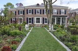 expanded by architect David Adler, the two gatehouses show the detailing and symmetry of Georgian Revival. The coach house is also