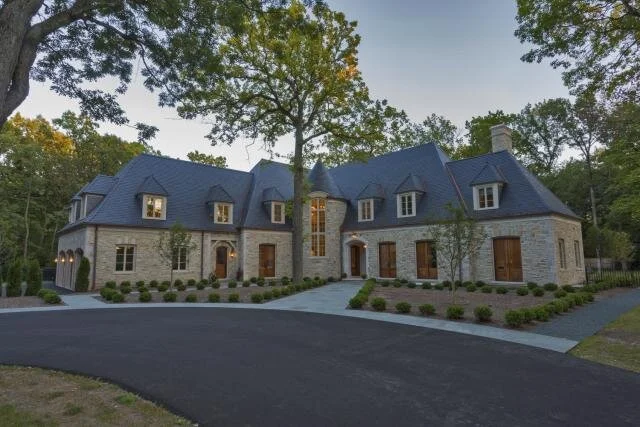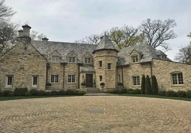 Nestled on a wooded lot with a dense canopy of large trees, this new stone and slate French Renaissance Revival house is both elegant and restrained. The dark slate roof, limestone cornice and quoins, random ashlar stone walls and stained wood doors are all characteristic of the French style. The simplicity of design not only compliments the site, but also does an excellent job being contextually compatible with other surrounding neighborhoods, Villa Turicum and Walden.