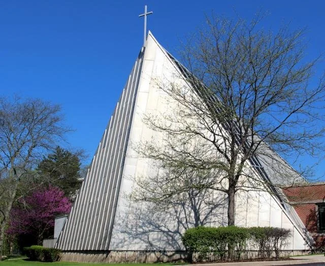 The shiny, southward-rising aluminum walls and two adjacent slashes of windows east and west of the mid-century modern Chapel at Woodlands date from the mid-century modern period. It compares with its contemporary Air Force Academy Chapel, near Colorado Springs, CO, that was designed by Walter Netsch of Skidmore Owings & Merrill (SOM), Chicago. The Woodlands Chapel’s dramatic stance echoes mmore directly also Frank Lloyd Wright’s c. 1950 wood-frame Unitarian Society, Madison, and a small masonry church that followed Wright’s lead as well, Le Corbusier’s Notre-Dame-du-Haut, Ronchamp, France, completed in 1955. In the best spirit of modernism, the Woodlands Chapel pursued new formal direction while also employing a new material. Preservation of this small modernist gem in Lake Forest lends distinction to the local diversity in architectural styles.